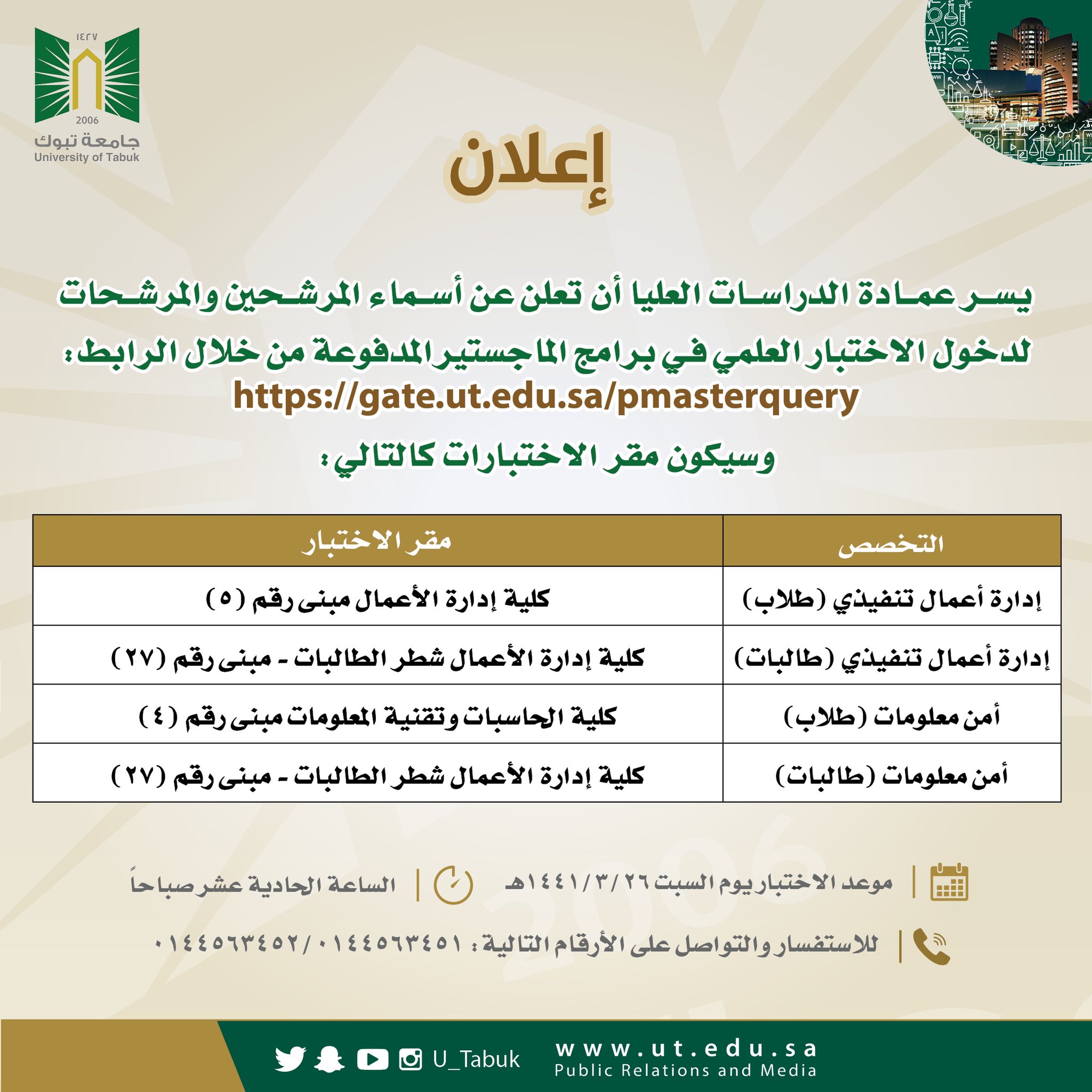 جامعة تبوك On Twitter إعلان يسر عمادة الدراسات العليا ب جامعة تبوك أن تعلن عن أسماء المرشحين والمرشحات لدخول الأختبار العلمي في برامج الماجستير المدفوعة ومواعيد الاختبارات ومقارها وذلك حسب الجدول المرفق U Tabuk