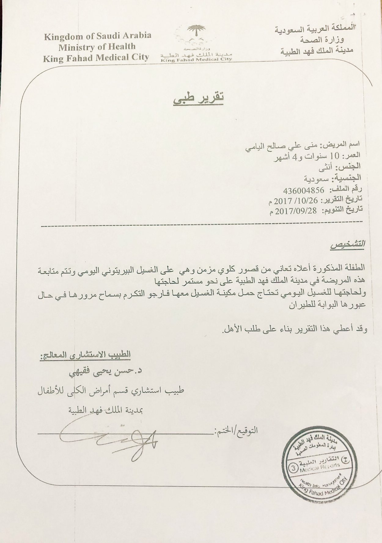 تقرير طبي من مستشفى الملك فهد