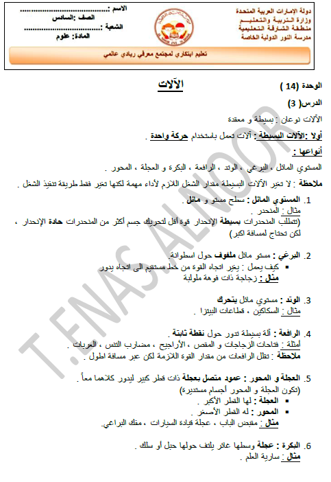 العلوم المتكاملة ملخص الآلات للصف السادس ملفاتي